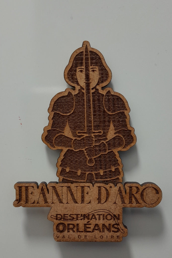Offrez-vous ce magnet en bois à l'effigie de Jeanne d'Arc pour égayer votre réfrigérateur ou tout autre support magnétique.
